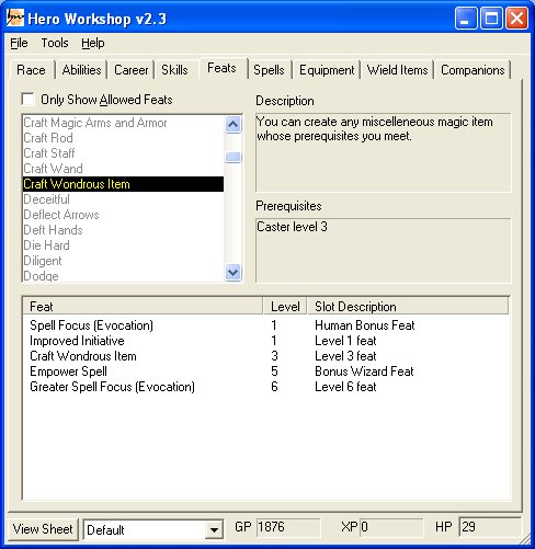 Add Feats, bonus fighter feats and bonus wizard feats. Hero Workshop will keep track of the feat-slots that you are granted by your race/classes, which feats you are allowed and will show you what the prequisites are for a feat.