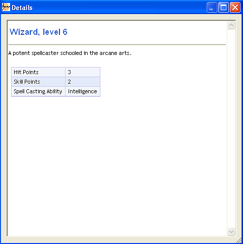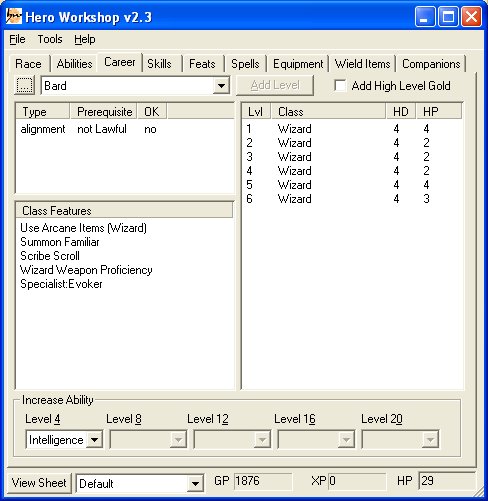 On the career dialog you can add class levels. Hero Workshop will not let you select a class whose prerequisite you do not meet. For example, some classes are restricted in their alignment choices and prestige classes have a variety of feat, racial, skill or spell capability requirements. Hero Workshop lists those prerequisites and tells you if you meet them. You will be prompted for class choices at this point if there are any for the classes you select. For example, level 1 Clerics must choose two domains. As you go up levels you will be able to specify ability advancement on this dialog. Note: New classes can be added by editing an XML file.