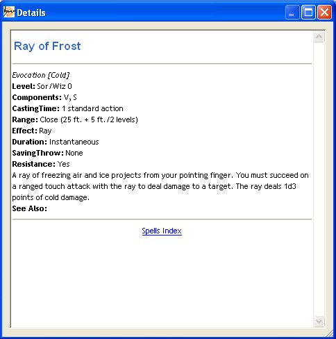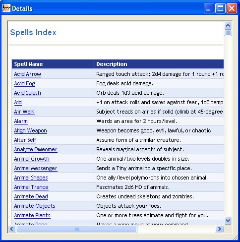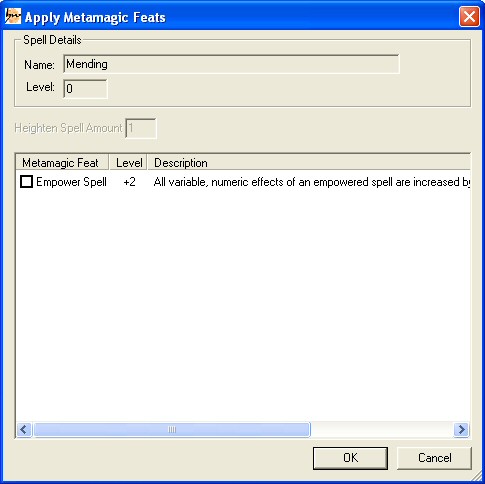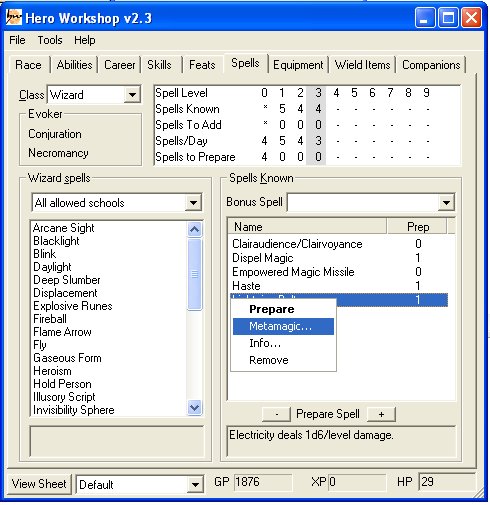 For each spell-casting class that you have levels in, you need to select spells. From here you can look up spell descriptions at the click of a button. You can also create metamagic spells to prepare. To apply metamagic feats, right click on the spell name and select 'metamagic'. Note: New spells can be added by editing an XML file.