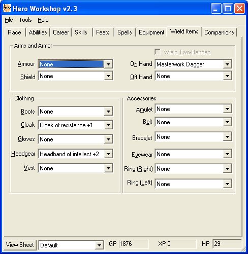 In Dungeons and Dragons, items must be worn or wielded in specific slots. For example, you can only wear one pair of magic boots at a time. This dialog allows you to specify which armor and magic items are being worn and which weapons are being held.